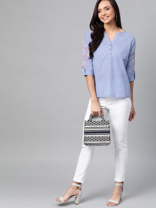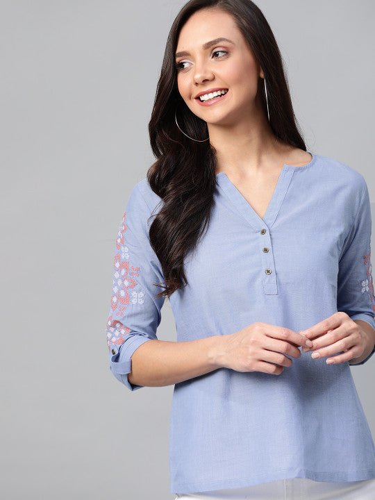 Blue solid woven regular top, has a round neck, three-quarter sleeves with embroidered detail, and button closure
