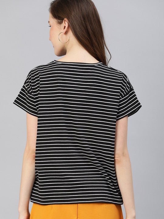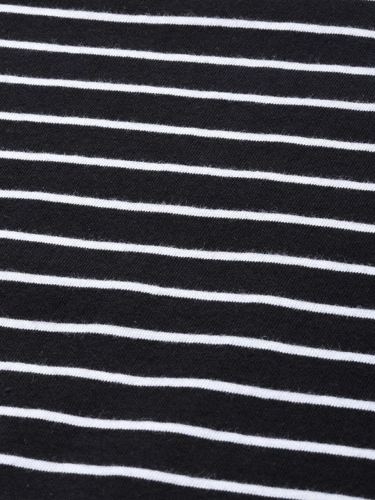 Black and White striped T-shirt, has a round neck, and short sleeves